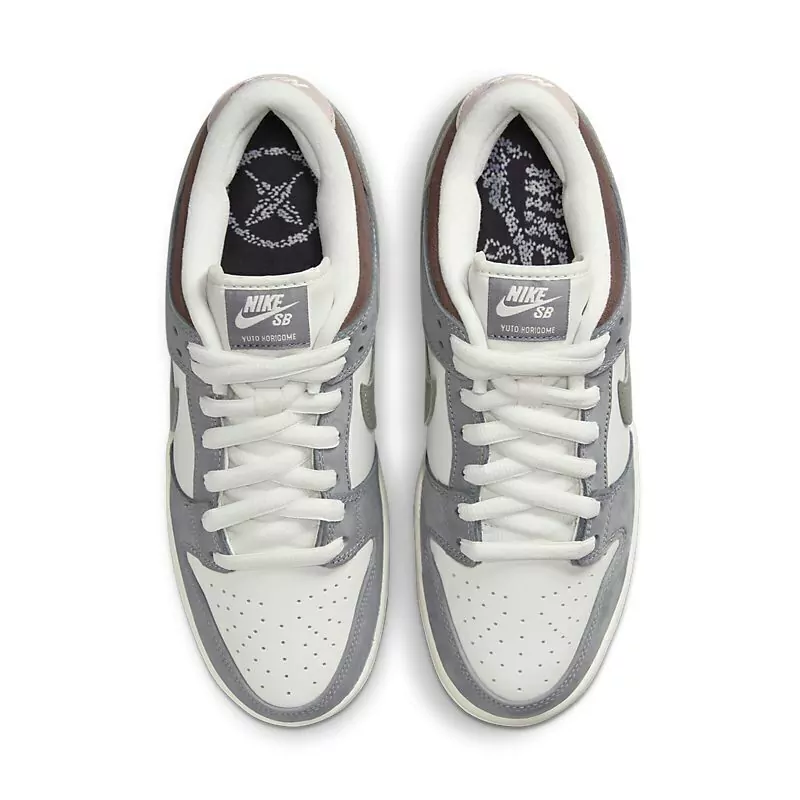 O Yuto Horigome x Nike Dunk Low SB oferece a silhueta clássica do skatista profissional japonês. O cano baixo faz uso de uma parte superior de couro branco, reforçada com sobreposições de camurça cinza no antepé e no calcanhar. Além de um Swoosh de couro em um tom diferente de cinza, os elementos da marca incluem um gráfico de pena cruzada no calcanhar lateral e o nome de Horigome anexado à etiqueta da língua Nike SB.